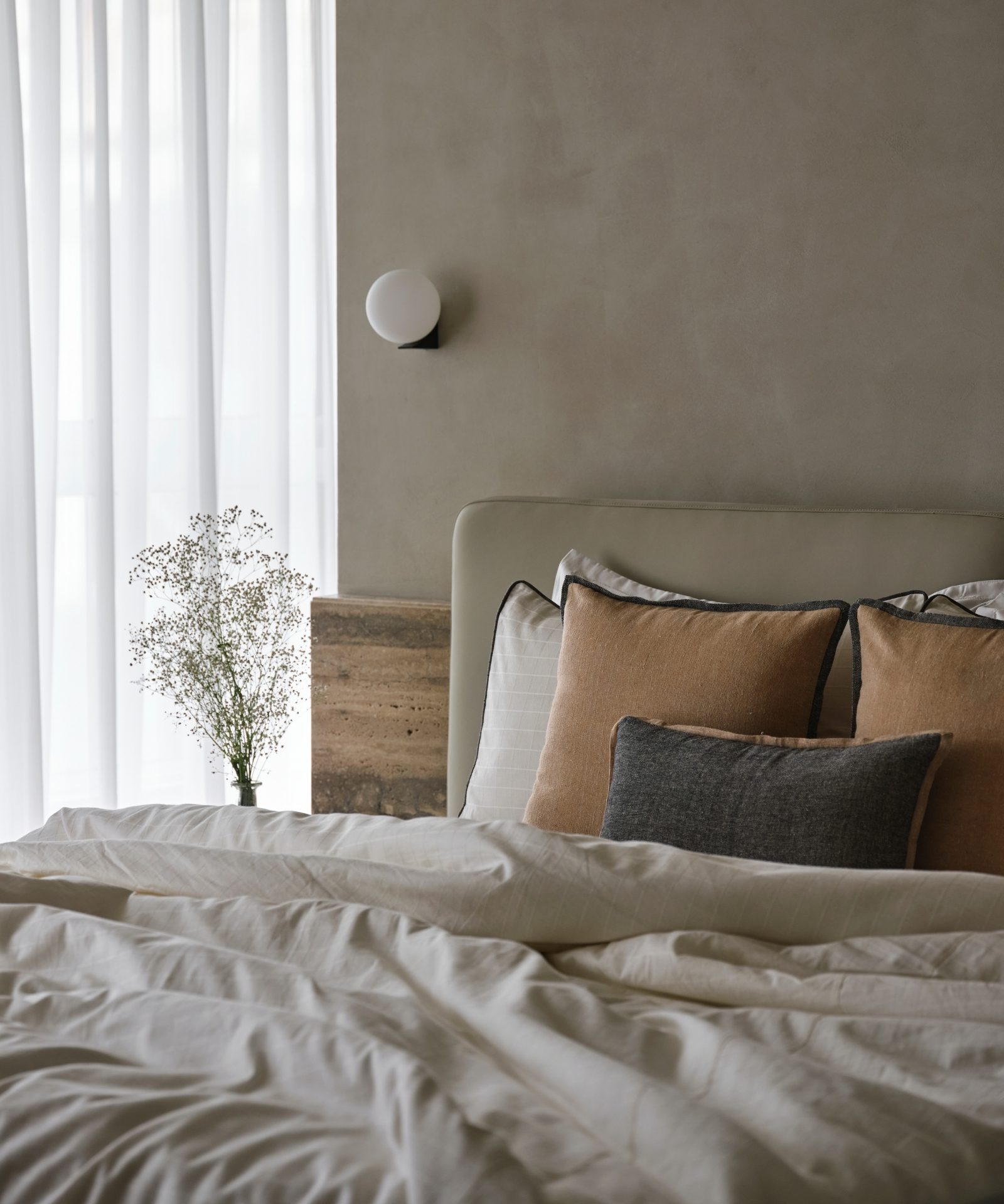 Tactile materials, from stuccoed plasters to textured timbers, lime plaster finishes, and even natural stones, bring in variation that isn’t uniform. Surfaces are left slightly irregular, and finishes are not overly refined, allowing the space to register through touch as much as through sight